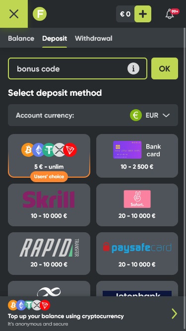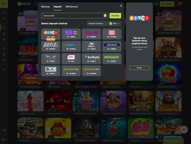 Казино Fresh предлагает надежные, безопасные и популярные способы оплаты, включая платежные карты, электронные кошельки, мобильные транзакции и различные криптовалютные платежи.