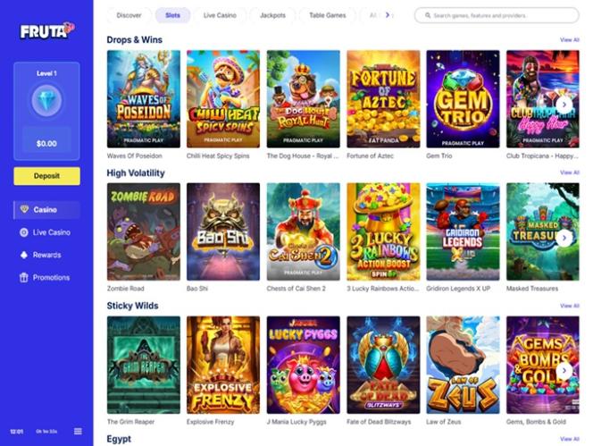Казино Fruta предлагает потрясающую коллекцию онлайн-слотов. Эта игровая библиотека превосходно организована и включает в себя такие подкатегории, как высокая волатильность, липкие вайлды, Египет, функция бесплатных вращений, гигантские символы, повторные вращения, джокер, Азия, падающие символы, умножающиеся вайлды, случайные вайлды, классические слоты, спорт, скретч-карты , покупка бонусов и многое другое.
