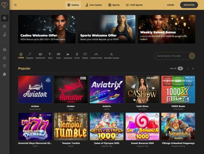Визуально оформление сайта отличается привлекательной цветовой палитрой, состоящей из темных фонов и золотых оттенков, что, несомненно, создает впечатление, будто этот бренд стремится предложить роскошный игровой опыт. Пользовательский интерфейс минималистичен и прост, а это значит, что у вас не возникнет проблем с просмотром всех разделов и страниц сайта.