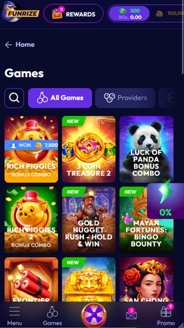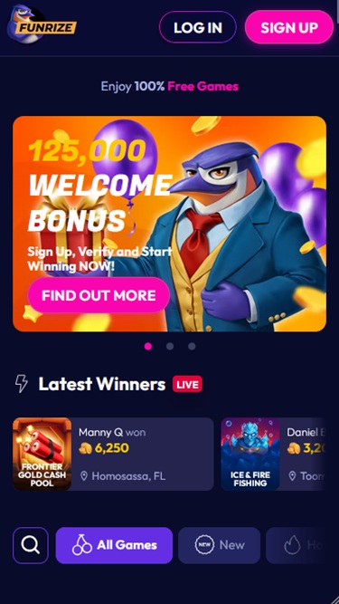 ПонравилосьFunrize стало для меня увлекательным казино в стиле тотализатора. Множество слотов и турниров поддерживают интерес, и мне нравится, что играть можно легально в большинстве штатов, используя бесплатные турнирные монеты или промо-билеты.