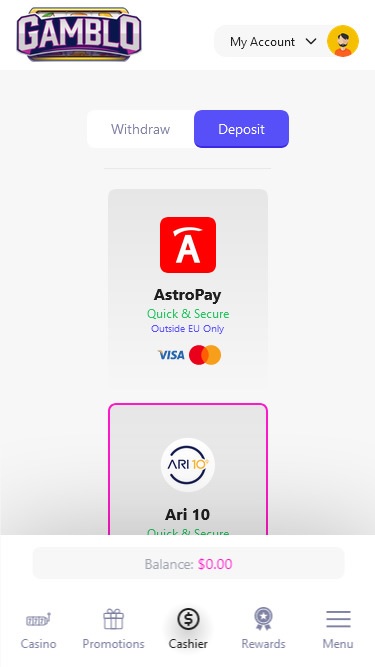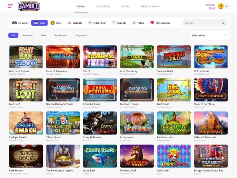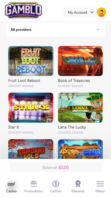 На момент написания этого обзора у Gamblo был скромный список поставщиков игр. Среди них Spadegaming и Concept Gaming, предлагающие игры в следующих категориях: Блэкджек, Слоты, Настольные игры, Турниры, Настольные игры, Игры с живыми дилерами, Турбо-игры и Другие.