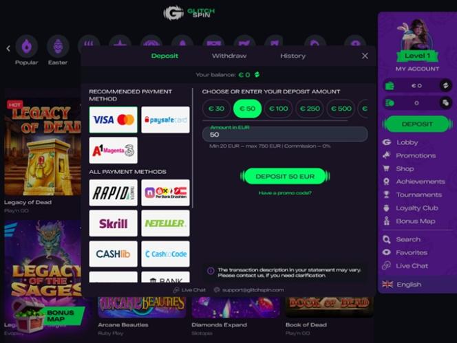 Платформа казино доступна со всех устройств . Независимо от того, предпочитаете ли вы свой персональный компьютер, смартфон или планшет, при наличии стабильного интернет-соединения вы сможете с головой погрузиться в лобби GlitchSpin. Давайте выясним, оправдывают ли предложения казино наши первоначальные ожидания!