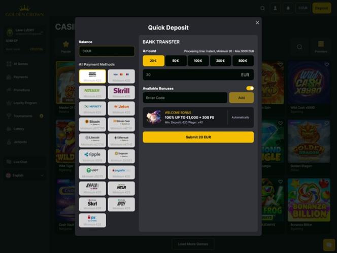 Golden Crown работает на платформе Microgaming, Net Entertainment, Playtech, BetSoft, Amatic Industries, Big Time Gaming, ELK Studios, Evolution Gaming, EYECON, Ezugi, Genesis Gaming, Habanero Systems, iSoftBet, lightningboxgames, Novomatic, Oryx, Play'n GO, playson, Quickspin, Relax Gaming, SOFTSWISS, Thunderkick, Vivo Gaming, Yggdrasil, Endorphina, Wazdan, GameArt, Booming Games, Pragmatic Play, Nolimit City, Red Tiger Gaming, Booongo, Spinomenal, Felix Gaming, Red Rake Gaming, Skillzzgaming, Fugaso, Belatra Games, Fantasma Games, Kalamba, Revolver Gaming, Spin Games, Platipus Gaming, Nucleus Gaming, Triple Edge Studios, BGAMING, Northern Lights Gaming, Fazi, Evoplay, Stormcraft Studios, IGTech, Switch Studios, Electric Elephant Games, Pocket Games Soft, Bulletproof Games, Gluck Games, Mascot Gaming, TVBet, NetGame Entertainment, Gameburger Studios, Pulse 8 Studios, Neon Valley Studios, Golden Rock Studios, Spearhead Studios, Swintt, TrueLab Games, SpinPlay Games, Mancala Gaming, 7Mojos, SmartSoft Gaming, KA Gaming, Atmosfera, Real Dealer Studios, Blue Guru Games, On Air Entertainment, Buck Stakes Entertainment, Eurasian Gaming, Games Global, Reevo, Amusnet Interactive, Ash Gaming, Blueprint Gaming, CT Interactive, Greentube, Merkur Gaming, Push Gaming, Tom Horn Gaming, Gamomat, Reel Time Gaming, Authentic Gaming, Bally Wulff, Old Skool Studios, Foxium, Just For The Win, Reflex Gaming, PearFiction Studios, Wild Streak Gaming, Slingshot Studios, Golden Hero, Fortune Factory Studios, 4ThePlayer, AvatarUX, Gamevy, Crazy Tooth Studio, High 5 Games, Groove Gaming, ReelPlay, Japan Technicals Games, Alchemy Gaming, Rarestone Gaming, Snowborn Games, Boomerang Studios, Hacksaw Gaming, Max Win Gaming, Gold Coin Studios, Bang Bang Games, Gamzix, Half Pixel Studios, Arcadem, SilverBack Gaming, Peter And Sons, Absolute Live Gaming, Aurum Signature Studios, Onlyplay, Lucksome Gaming, Gamebeat, Playgon, Area Vegas, Bombay Live, 3 Oaks Gaming, Wishbone Games, Apparat Gaming, Spribe, Circular Arrow, Print Studios, 1spin4win, 5Men Gaming, HammerTime Games, Four Leaf Gaming, INO Games, Nailed It! Games, Atomic Slot Lab, Neko Games, Reel Kingdom, Oros Gaming, Givme Games, JVL, Indigo Magic, Live88 and Zillion Games , а игры предоставляются через веб-платформу, что означает, что вам не нужно ничего скачивать на свой компьютер. Сайт довольно простой, но функционирует достаточно хорошо. Поддерживается игра на мобильных устройствах, позволяя игрокам участвовать в игре через свои смартфоны и планшеты.