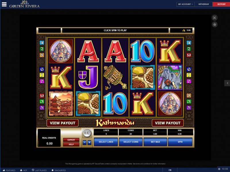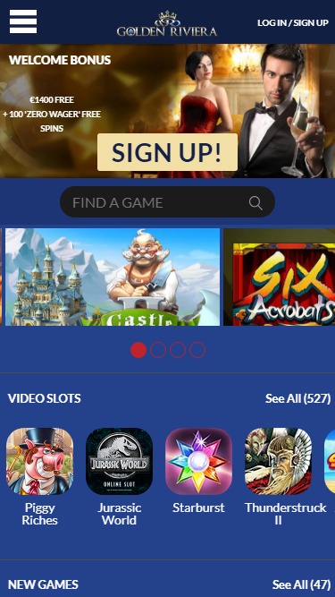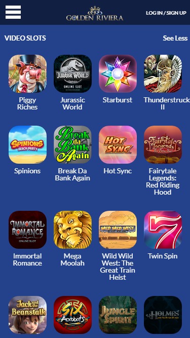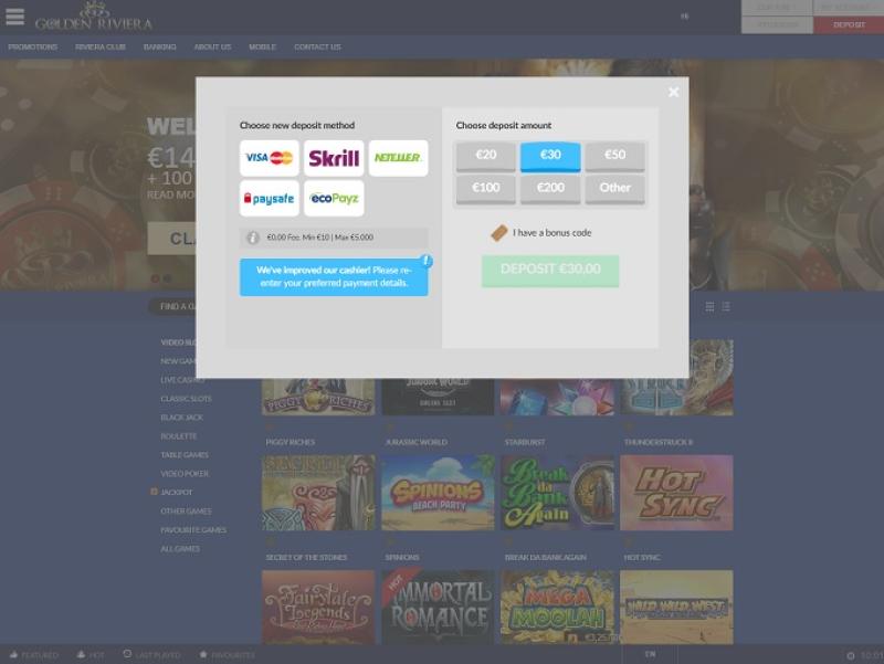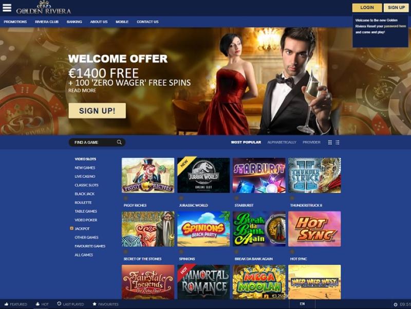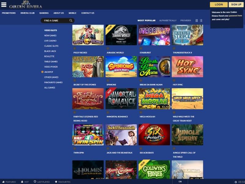 В казино Golden Riviera представлен широкий выбор слотов, включая полный ассортимент игр от Microgaming. Здесь вы найдете несколько вариаций традиционных видеослотов, а также несколько прогрессивных джекпотов, таких как Mega Moolah, King Cashalot и Major Millions.