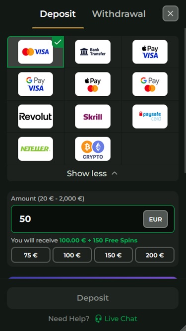 Казино предлагает множество способов пополнения и вывода средств, таких как Apple Pay , Google Pay, банковский перевод, кредитные и дебетовые карты, Skrill, Paysafecard, Neosurf, Revolut , Interac и другие. Имейте в виду, что доступность способов оплаты зависит от страны игрока, поэтому убедитесь, что предпочитаемые вами способы оплаты доступны.