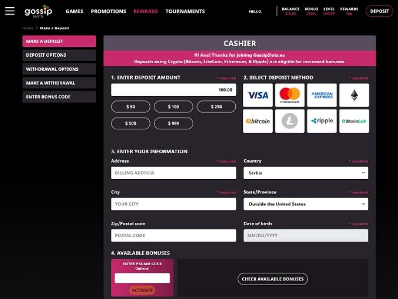 Помимо настольных игр, игровых автоматов и видеопокера, Gossip Slots предлагает своим игрокам скретч-карты, кено и виртуальные скачки.