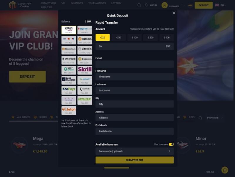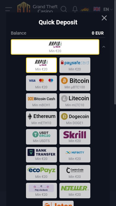 Мы настоятельно рекомендуем вам самостоятельно ознакомиться с остальной частью текста, чтобы быть в курсе всех необходимых условий. Что касается способов оплаты, Grand Thef Casino предлагает игрокам возможность пополнять счет криптовалютой, если они того пожелают. Помимо этого, игроки могут выбрать один из самых популярных способов оплаты, таких как Visa, MasterCard, Neosurf, Neteller, PaysafeCard и многие другие. Игроки также могут пополнять счет с помощью Skrill, если им это удобно.