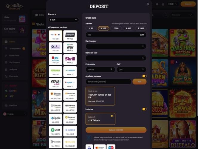 Система банковских операций в Gunsbet превосходна, поскольку казино предлагает пополнение и вывод средств через банковский перевод, iDeal, Maestro, MasterCard, Skrill, Neteller, Paysafecard, Visa, Sofort, Trustly, Bitcoin, Zimpler и другие. Выплаты через Bitcoin и электронные кошельки происходят мгновенно, а обработка платежей с кредитных и дебетовых карт занимает несколько дней. Следует отметить, что существует лимит на вывод выигрышей в размере 10 000 долларов в неделю и 30 000 долларов в месяц.