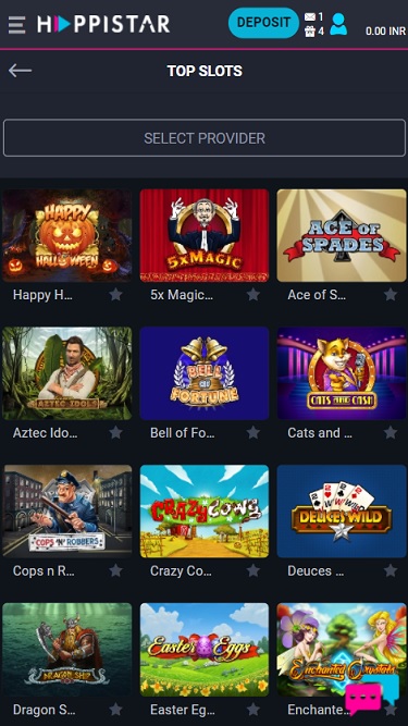 В казино HappiStar представлен широкий выбор игровых автоматов от ведущих разработчиков, таких как Microgaming и Play'n GO. Игры отличаются высоким качеством и их легко найти. Также доступны мобильные слоты.