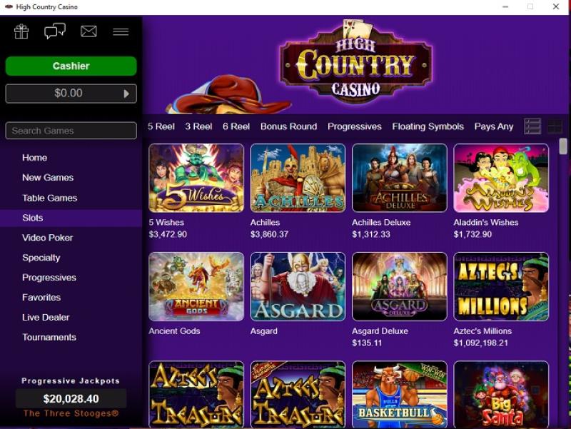На сайте High Country представлен широкий выбор игровых автоматов, включая как классические модели, так и современные 5-барабанные варианты. Тематика игр разнообразна, но большинство из них похожи друг на друга. Более современные игры предлагают более приятный игровой процесс и поддерживают мобильную версию. Также доступны прогрессивные джекпоты, дающие (небольшой) шанс выиграть крупный денежный приз за один спин.