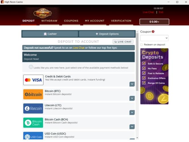 Варианты банковских операций в High Noon Casino