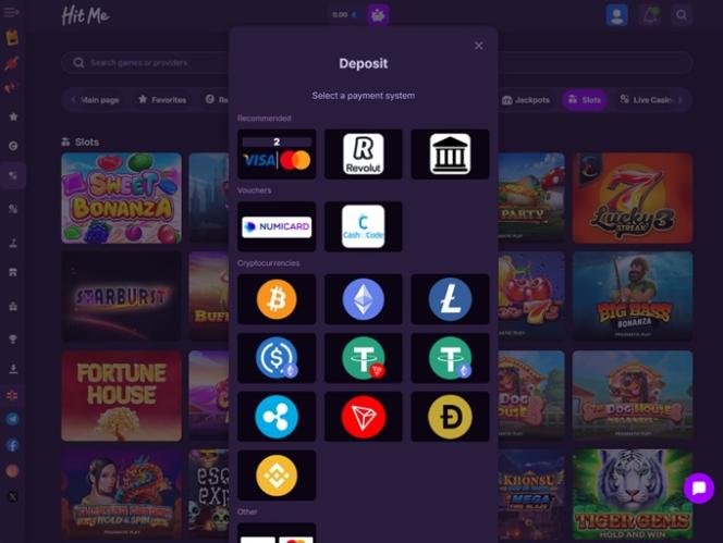 Казино Hit Me Bet — это в первую очередь онлайн-казино, ориентированное на криптовалюты, а это значит, что игроки могут использовать множество криптовалют для пополнения и вывода средств. Среди доступных вариантов — Bitcoin , Bitcoin Cash , Dogecoin , Ethereum , Tron , Tether и Ripple . Кроме того, сайт принимает традиционные банковские переводы, такие как Bank Wire Transfers , Revolut и Interac .