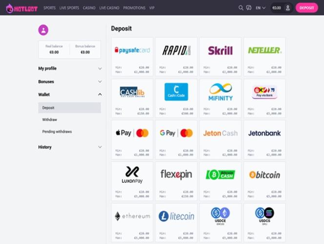 Как только мы вошли, первое, что бросилось в глаза, — это насколько хорош общий внешний вид сайта HotLoot Casino. Их графический отдел, похоже, подобрал идеальную цветовую схему, обеспечивающую приятное для глаз впечатление, но не только это, весь интерфейс работает довольно плавно независимо от используемого устройства.