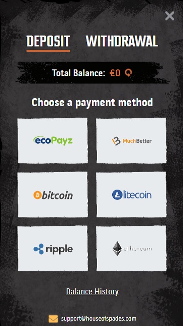 Несмотря на то, что касса казино House Of Spades зависит от страны, она поддерживает различные способы оплаты, включая криптовалютные платежи, независимо от того, в какой игорной юрисдикции вы находитесь.