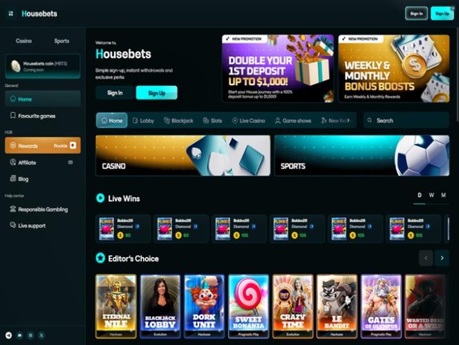 Казино Housebets — это ориентированное на глобальный рынок онлайн-казино, предлагающее разнообразную игровую библиотеку , а также являющееся полноценной букмекерской конторой, которая, помимо прочего, поддерживает ставки в режиме реального времени.
