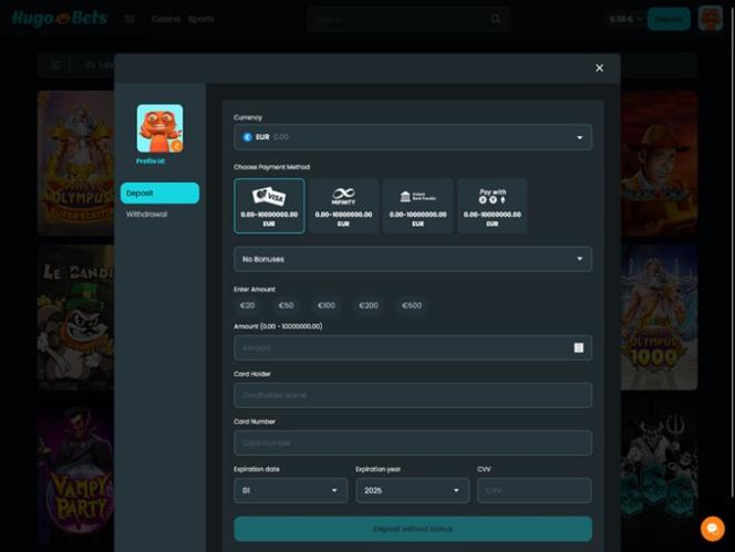 Для пополнения и вывода средств со своего счета в казино HugoBets предлагает множество способов оплаты, включая Visa , Mastercard, банковский перевод , Neteller, MiFinity , Google Pay и Skrill . Кроме того, игроки могут управлять своими средствами, используя несколько криптовалют, включая Bitcoin , Cardano, Dogecoin, Ethereum , Solana, Tron , Tether и Ripple .
