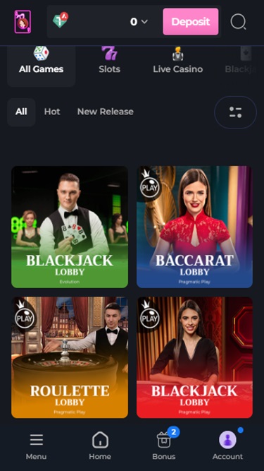 Благодаря ярким цветам, красочным фотографиям и привлекательной анимации, это казино визуально привлекательно и заманчиво, а дизайн веб-сайта казино современный и удобный для пользователя . Темный фон, визуально дополненный розовыми неоновыми кнопками, создает элегантный и стильный вид, который нам очень понравился во время нашего визита.
