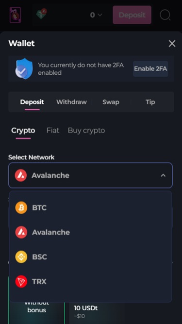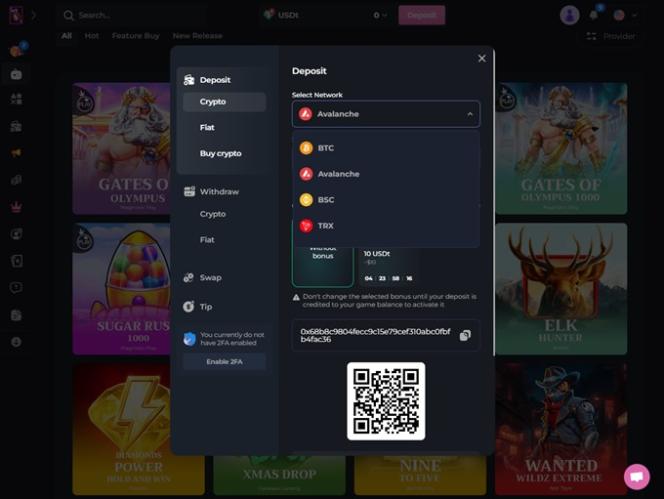 Для тех, кто предпочитает фиатные валюты , казино предлагает платежный шлюз для фиатных платежей, позволяющий игрокам совершать транзакции в традиционных валютах, таких как тайский бат (THB), малайзийский ринггит (MYR), индонезийская рупия (IDR) и филиппинский песо (PHP).
