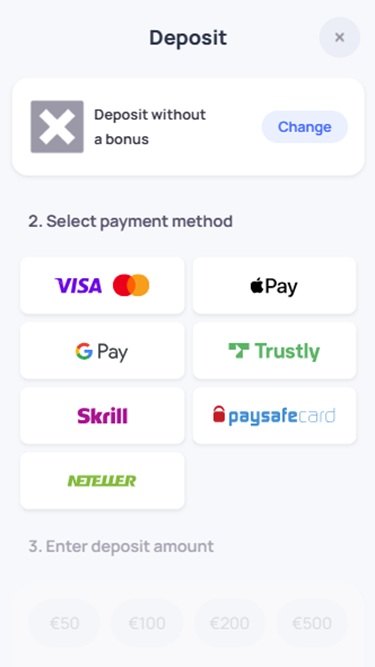 Среди доступных игрокам способов пополнения счета и вывода средств — Apple Pay, Google Pay, популярные платежные карты, электронные кошельки, такие как Neteller, Skrill, Revolut, а также другие банковские сервисы. Следует помнить, что некоторые из них могут быть недоступны в вашем регионе, поскольку способы оплаты зависят от страны, и в некоторых юрисдикциях определенные способы оплаты могут быть недоступны для онлайн-азартных игр.