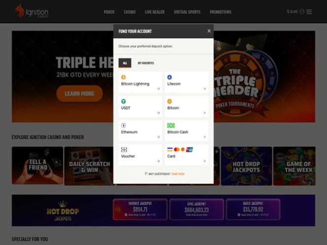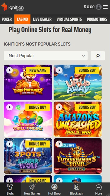 В казино Ignition представлен широкий выбор видеослотов, а также прогрессивные джекпоты, дающие игрокам шанс выиграть крупные призы на тысячи долларов.