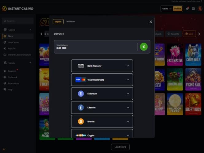 Также стоит отметить, что Instant Casino — это крипто-дружественный сайт , предлагающий лучшие игры казино различных жанров, включая игры с живыми дилерами и такие категории, как рулетка , блэкджек , баккара , покер , игровые шоу и многое другое. Включена программа лояльности, а также привлекательные промо-акции и турниры.