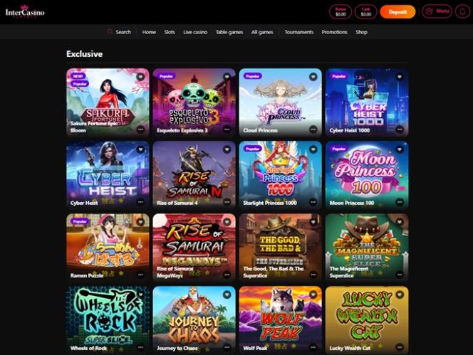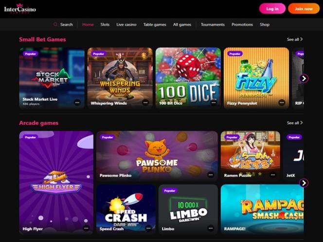 InterCasino работает на программном обеспечении Amaya, Microgaming, Net Entertainment, Playtech, 1x2gaming, Barcrest, Big Time Gaming, ELK Studios, Evolution Gaming, EYECON, Ezugi, Habanero Systems, iSoftBet, lightningboxgames, Oryx, Play'n GO, Quickspin, Rabcat, Relax Gaming, Thunderkick, Yggdrasil, Wazdan, Realistic Games, Booming Games, Stakelogic, Pragmatic Play, Nolimit City, Red Tiger Gaming, Fantasma Games, Kalamba, Spin Games, Skywind, Triple Edge Studios, Northern Lights Gaming, Evoplay, Stormcraft Studios, OneTouch, Electric Elephant Games, Pocket Games Soft, Triple PG, Bulletproof Games, All41 Studios, Gameburger Studios, Pulse 8 Studios, Slot Factory, Neon Valley Studios, Shuffle Master, SpinPlay Games, HungryBear Gaming, SmartSoft Gaming, Blue Guru Games, Buck Stakes Entertainment, Games Global, Bally Technologies, bluberi, Endemol Games, Leander Games, NextGen, NYX Interactive, Push Gaming, Tom Horn Gaming, WMS, Gaming Realms, SG Interactive, Gamomat, Red7Mobile, CORE Gaming, Scientific Games, Side City Studios, Iron Dog Studio, Foxium, Betdigital, Just For The Win, Reflex Gaming, PearFiction Studios, Wild Streak Gaming, Slingshot Studios, Fortune Factory Studios, Jade Rabbit Gaming, STHLM Gaming, 4ThePlayer, AvatarUX, Gamevy, Crazy Tooth Studio, Pirates Gold Studios, ReelPlay, Japan Technicals Games, Alchemy Gaming, Snowborn Games, Boomerang Studios, Hacksaw Gaming, Max Win Gaming, Gold Coin Studios, Bang Bang Games, Slotmill, SilverBack Gaming, Peter And Sons, Aurum Signature Studios, Area Vegas, RAW iGaming, Leap Gaming, Wishbone Games, Spribe, Print Studios, Gaming Corps, Four Leaf Gaming, INO Games, Nailed It! Games, Atomic Slot Lab, Neko Games, Reel Kingdom, Oros Gaming, Indigo Magic, Light & Wonder and Live88 , предоставляя своим клиентам большое количество игр. Игры доступны непосредственно через веб-браузер, поскольку для регистрации, внесения депозита и начала игры не требуется никаких загрузок.