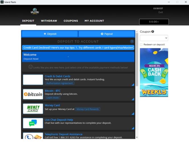Сделал несколько депозитов здесь, на самом деле, это было одно из первых казино RTG, в котором я играл на реальные деньги. Честно говоря, нет, я буду против Island Reels, но они отрезали мне бонусы после 2 депозитов и 1 бонуса после этого. Я был довольно новичком на сцене, поэтому я думал, что это нормально.