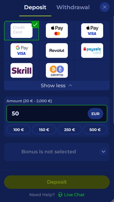 Для пополнения и вывода средств со своего счета в казино Ivybet вы сможете использовать несколько способов оплаты, включая Visa , Mastercard , Apple Pay, банковский перевод , Google Pay , Revolut, Neosurf и Paysafecard . Также принимаются различные криптовалюты, такие как Bitcoin , Bitcoin Cash, Dogecoin, Ethereum, Litecoin, USD Coin, Tether и Tron .