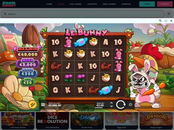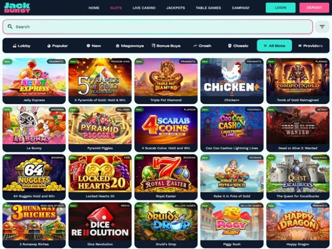 JackBurst относится к золотой средней категории онлайн-казино, то есть в портфеле не так много популярных компаний , но с перечнем из более чем 60 наименований это очень конкурентоспособная платформа в сфере онлайн-игр: Net Entertainment, BetSoft, 1x2gaming, Big Time Gaming, Evolution Gaming, Ezugi, Habanero Systems, iSoftBet, Play'n GO, playson, Relax Gaming, Thunderkick, Yggdrasil, Endorphina, Wazdan, Booming Games, Pragmatic Play, Nolimit City, Red Tiger Gaming, Booongo, Red Rake Gaming, Kalamba, Triple Edge Studios, Northern Lights Gaming, Fazi, Evoplay, Stormcraft Studios, Pocket Games Soft, Bulletproof Games, All41 Studios, Gluck Games, Gameburger Studios, Neon Valley Studios, HungryBear Gaming, Buck Stakes Entertainment, Games Global, Reevo, Amusnet Interactive, Blueprint Gaming, Gamomat, Reel Time Gaming, BF Games, Bally Wulff, Iron Dog Studio, Foxium, Just For The Win, Reflex Gaming, PearFiction Studios, Fortune Factory Studios, STHLM Gaming, 4ThePlayer, AvatarUX, Gamevy, Crazy Tooth Studio, Alchemy Gaming, Boomerang Studios, Hacksaw Gaming, Bang Bang Games, Peter And Sons, Aviatrix, 3 Oaks Gaming, Spribe, Atomic Slot Lab, Reel Kingdom, Galaxsys, Kitsune Studios and Penguin King