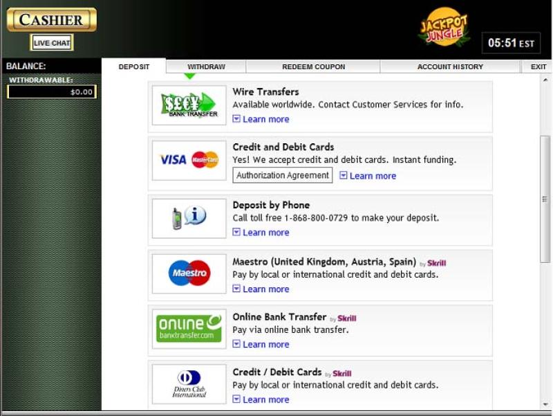 Казино Jackpot Jungle работает на программном обеспечении Real Time Gaming , а игры доступны как в виде загружаемого программного обеспечения, так и в виде платформы мгновенной игры, позволяющей играть через веб-браузер. Для тех, кто хочет играть на ходу, также доступна мобильная версия сайта.Другие игры