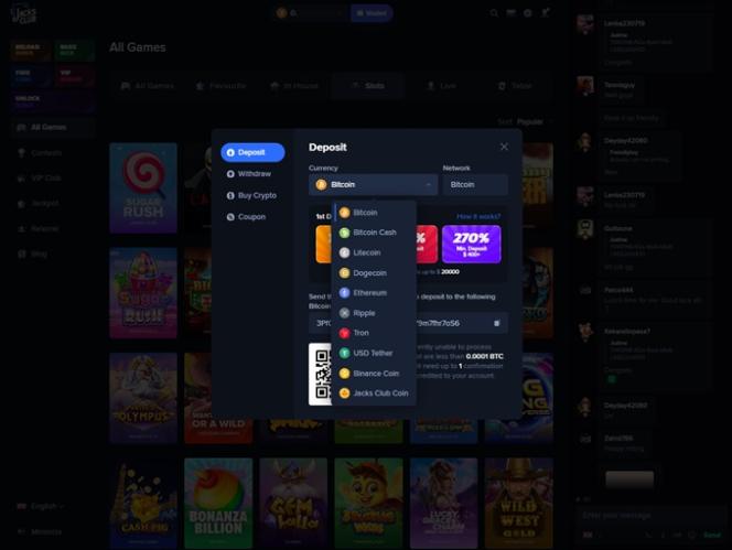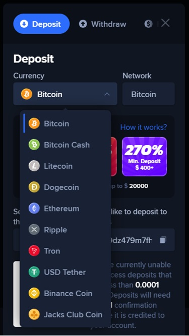 Казино JacksClub — это ориентированная на криптовалюты игровая платформа с интегрированной системой доказуемой честности, гарантирующей справедливость и проверяемость результатов игр. Платформа принимает несколько валют, таких как Bitcoin, Bitcoin Cash , Dogecoin , Litecoin , Ethereum , Tether , Tron , Ripple и JacksClub Coin. К сожалению, этот современный способ оплаты означает, что игроки не могут использовать традиционные варианты, такие как дебетовые карты и электронные кошельки, для пополнения счета и вывода средств.