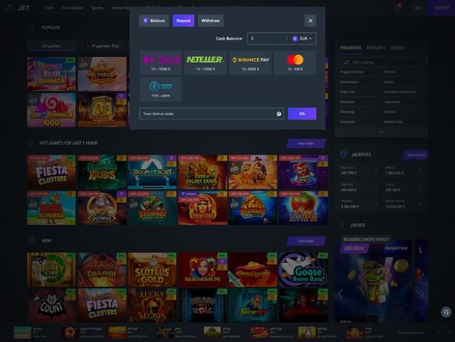 Казино Jet предлагает разнообразную коллекцию игровых автоматов: Shining Crown, Midas Golden Touch, Supreme Hot, Book of Dead, Iron Bank, Sakura Fortune, Legacy of Dead, Temple Tumble Megaways, Wild Harlequin, Greta Goes Wild, Razor Shark, 10 Burning Heart, Sun of Egypt 2, Valley Of The Gods, Burning Hot, Million Dracula, Rich Wilde and the Tome of Madness, Lucky Streak 2, Huge Catch, Lucky Dama Muerta, Braindead, Jammin' Jars 2, 100 Burning Hot, Pimped, Ultimate Hot, 100 Super Hot, Fire Joker, Hit the Gold! Hold and Win, Dinopolis, 27 Wins, Van der Wilde and the Outlaws, Mongol Treasure, Money Train 2, Wild Toro II, Evil Goblins, 50 Amazons' Battle, Book of Santa, Minotaurus, Esqueleto Explosivo 2, Rise of Merlin, Book of Horror, Lucky 100 Bells и другие.
