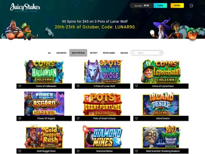 В казино Juicy Stakes представлено ограниченное количество игровых автоматов, включая как видеоигры, так и классические игры.