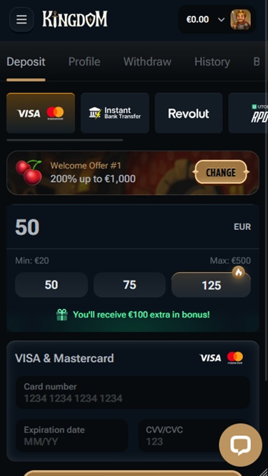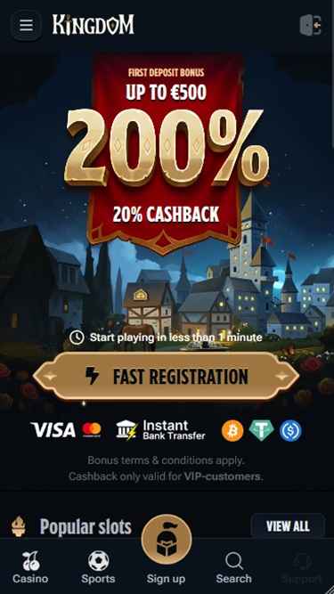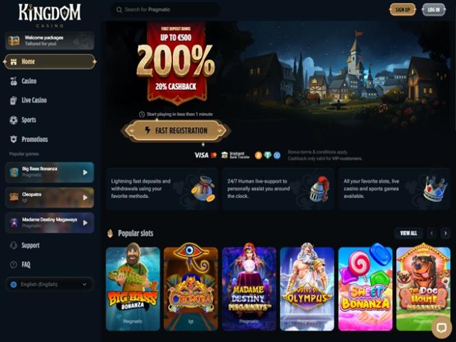 Что касается акций и бонусов, Kingdom Casino не может похвастаться самым обширным списком преимуществ для своих игроков. Однако бренд предлагает огромный приветственный бонус, призванный облегчить начало игры для новых игроков.