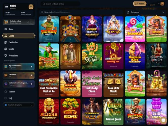 Madame Destiny Megaways , Big Bass Bonanza, Book of Ra Classic, Great Rhino Megaways, Amazon Queen, Immortal Romance, Cleopatra, Fishin' Frenzy, Energy Coins, Sugar Rush, Wolf Gold, Wanted Dead or a Wild, 9 Masks of Fire, Rise of Olympus 100, Book of Gold Multichance, Razor Shark, Mustang Gold, Reactoonz 2, Jammin' Jars 2, Le Pharaoh, Starlight Princess 1000, King Tusk, Chilli Heat Megaways, Fire in the Hole 2, Age of Conquest и Quick Hit Sper Wheel Wild Red.