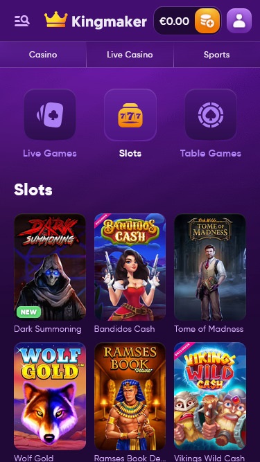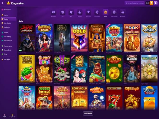 Слоты — огромная часть любого онлайн-казино. Учитывая огромное количество разработчиков программного обеспечения, представленных в Kingmaker Casino, неудивительно, что у вас будет невероятный выбор одноруких бандитов. Наиболее популярные игры здесь: Lucky Dwarfs, Vikings Wild Cash, Green Chilli 2, It's Shark Time, Book of Rampage, Sugar Spins, Temple Tumble Megaways, Fortune Five, Wild Piranha, Mental, Wild Lucky Clover, More Magic Apple, 777 Strike, Razor Returns, Bullet Hole и Shining Crown.