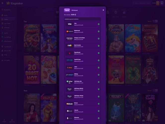 В отличие от других казино, Kingmaker предлагает множество традиционных и современных способов оплаты. Например, вы можете использовать различные кредитные карты и электронные кошельки, такие как Visa , Mastercard , Jeton , Neteller и другие. Кроме того, доступен широкий выбор криптовалют, таких как Bitcoin , Litecoin , Dogecoin и другие.