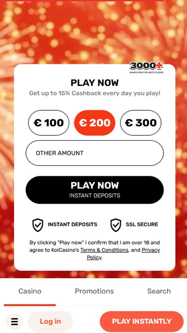 К сожалению, Koi Casino не предлагает большого количества рекламных акций. Тем не менее, новым зарегистрированным игрокам будет предложено выгодное приветственное предложение, а постоянным игрокам доступны ежедневные кэшбэк-бонусы, турниры по слотам и розыгрыши призов в казино и лайв-казино.