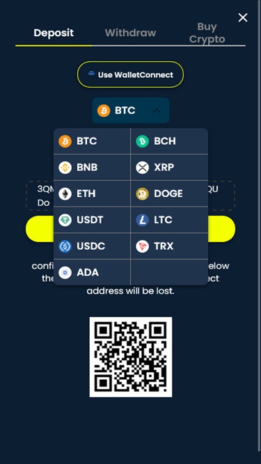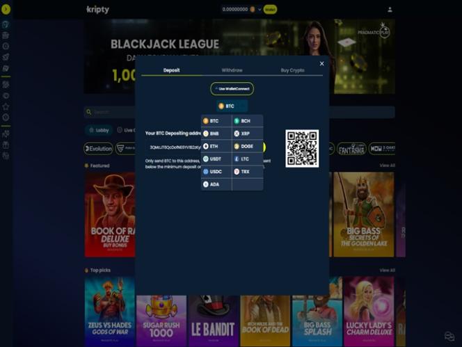 Этот сайт азартных игр, ориентированный исключительно на криптовалюты, позволяет игрокам выводить и вносить средства только с помощью таких криптовалют, как Bitcoin , Bitcoin Cash , Dogecoin , Cardano , Ethereum , Litecoin , Tron , USD Coin , Tether и Ripple . Тем, кто еще не знаком с криптовалютами, не стоит беспокоиться, поскольку оператор позволяет игрокам покупать криптовалюту напрямую в казино, используя традиционные банковские методы, такие как Visa и Mastercard .