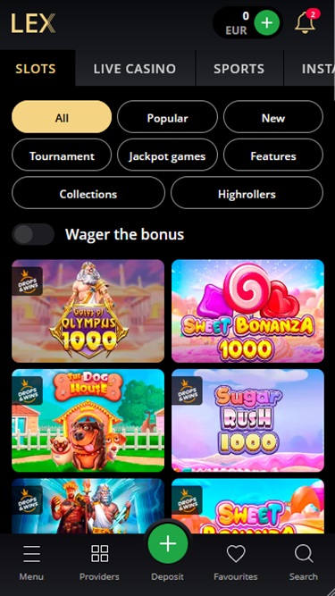 Кроме того, в верхней части сайта LEX Casino есть горизонтальное меню, где вы можете быстро получить доступ к основным игровым опциям, акциям, бонусам и VIP-клубу. Меню также позволяет переключать язык сайта на английский, русский, немецкий, португальский, испанский и французский.