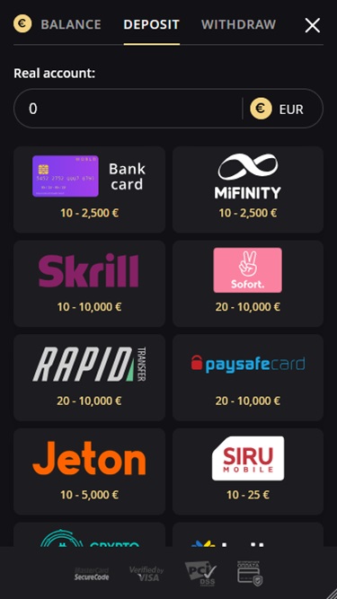 После входа на сайт вас встретит главная страница, где вы сможете перейти ко всем остальным разделам. Центральный раздел не отнимает ваше время ненужной информацией, а сразу же сообщает о принимаемых способах транзакций, приветственном бонусе, джекпотах и последних победителях платформы.