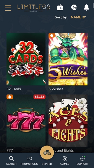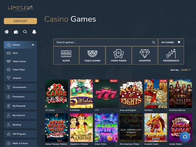Платформа казино Limitless Casino использует темный фон с множеством глубоких синих, серых и золотых деталей, а также интересными графическими иллюстрациями, которые выглядят стильно и элегантно, и в то же время весело и увлекательно. Хотя в казино отсутствует раздел с живыми дилерами, оно предлагает игрокам множество других жанров игр, и все разделы хорошо организованы.