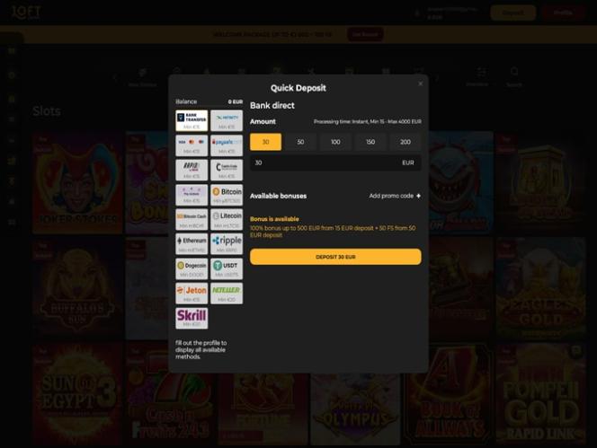 Что касается общего дизайна и пользовательского опыта, пользователей встречает главная страница, позволяющая легко перемещаться по всей платформе. В верхней части этой страницы размещен рекламируемый приветственный пакет, а также все категории игр, предлагаемые казино.