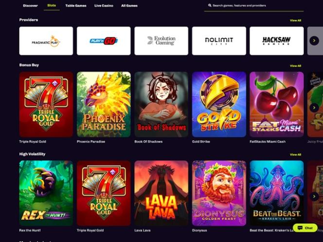 Игрокам, которые не знают, с чего начать, мы рекомендуем попробовать игры от самых влиятельных разработчиков программного обеспечения в индустрии, таких как BetSoft , Big Time Gaming , Evolution Gaming , NetEnt , Relax Gaming , Thunderkick , Nolimit City, Pragmatic Play , Fantasma Games , Red Tiger Gaming и Golden Rock Studios .