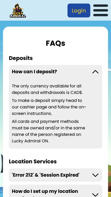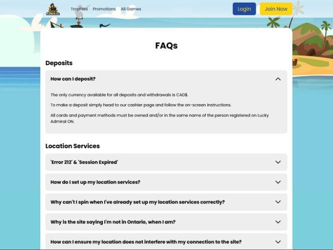 Lucky Admiral Ontario регулируется и лицензируется Комиссией по алкоголю и азартным играм Онтарио (AGCO). Бренд принимает на свою платформу исключительно игроков из Онтарио и приглашает их зарегистрироваться и ознакомиться со всеми предлагаемыми развлечениями и играми.