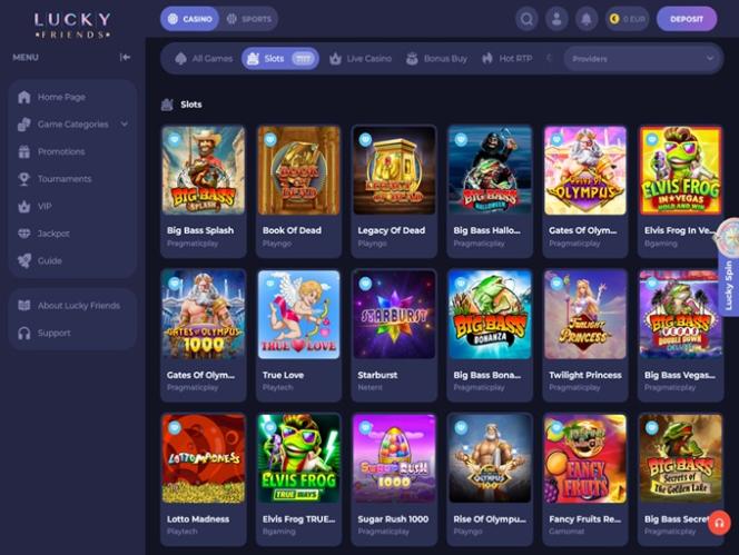 Если вы полный новичок и не знаете, с чего начать, мы предлагаем вам погрузиться в постоянно расширяющийся выбор слотов на реальные деньги, доступных в Lucky Friends. Казино предлагает тысячи захватывающих слотов, которые вы можете изучить, и они представлены в различных категориях и жанрах.