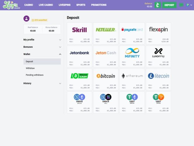 Варианты банковских операций в Lucy's Casino