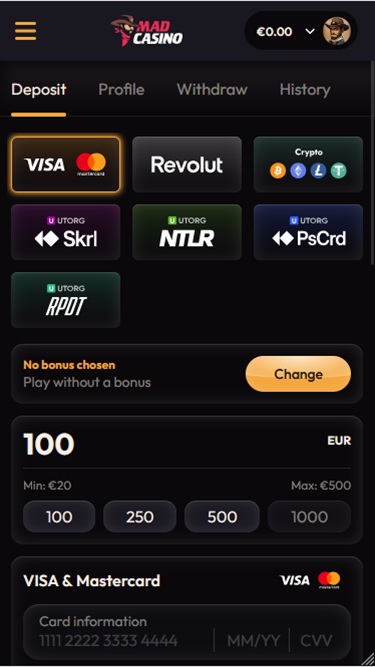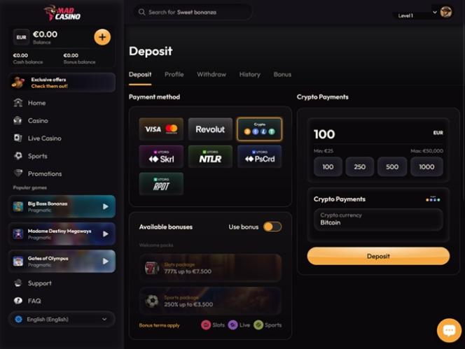 Mad Casino — это современный игорный сайт, запустивший свой веб-сайт для игроков в 2025 году. С момента своего создания бренд завоевал большую аудиторию, предоставляя доступ к криптовалютам и широкий выбор игр и развлечений, таких как слоты, игры с живыми дилерами, настольные игры и ставки на спорт, а также предлагая небольшой, но солидный выбор бонусов.