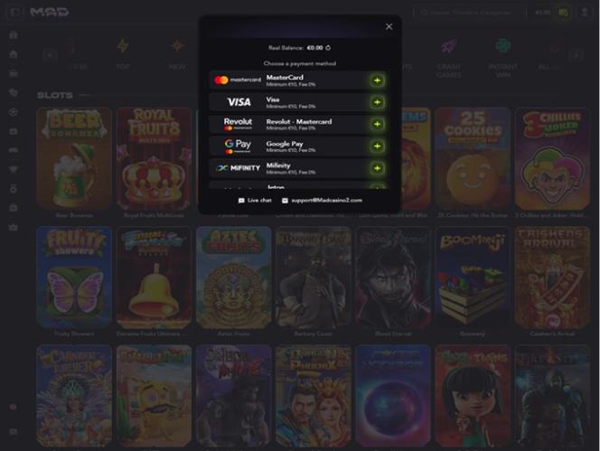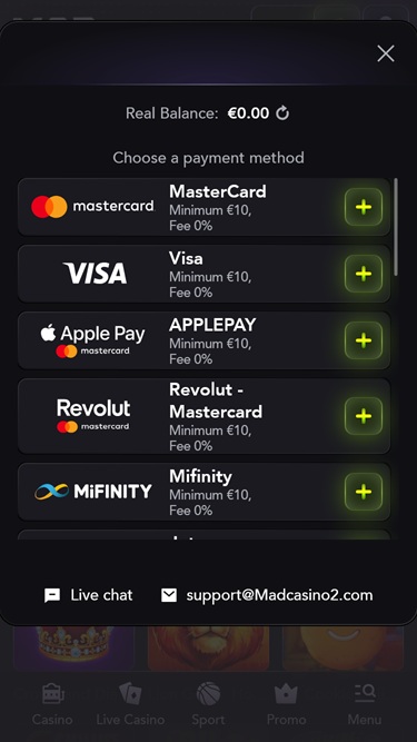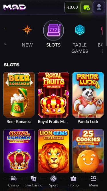 Оператор предлагает игры от более чем ста компаний-разработчиков программного обеспечения для казино, таких как NetEnt, Evolution Gaming, Quickspin… Как мы уже упоминали, MadCasino также предлагает богатый раздел ставок на спорт с популярными видами спорта: футбол, баскетбол, волейбол, теннис, скачки…