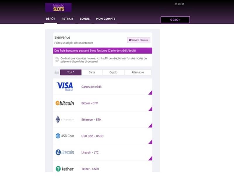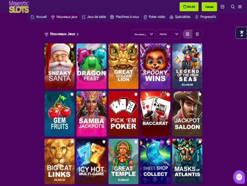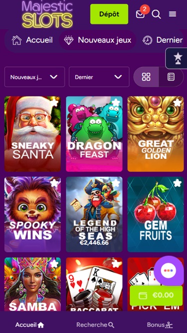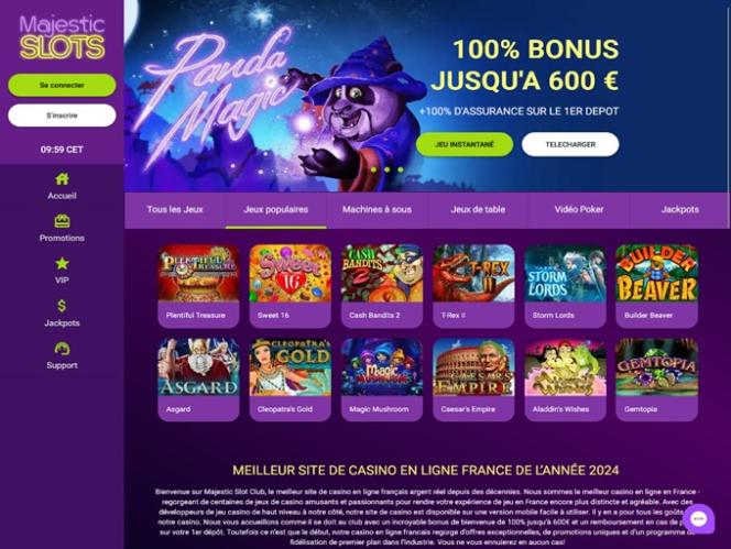 Казино Majestic Slots — это онлайн-букмекерская контора, основанная в 2012 году и ориентированная на французский рынок ставок. Казино отличается эффектным дизайном и предлагает достойный выбор игр, быстрые выплаты и отличную поддержку клиентов, что делает его хорошим местом для игры.